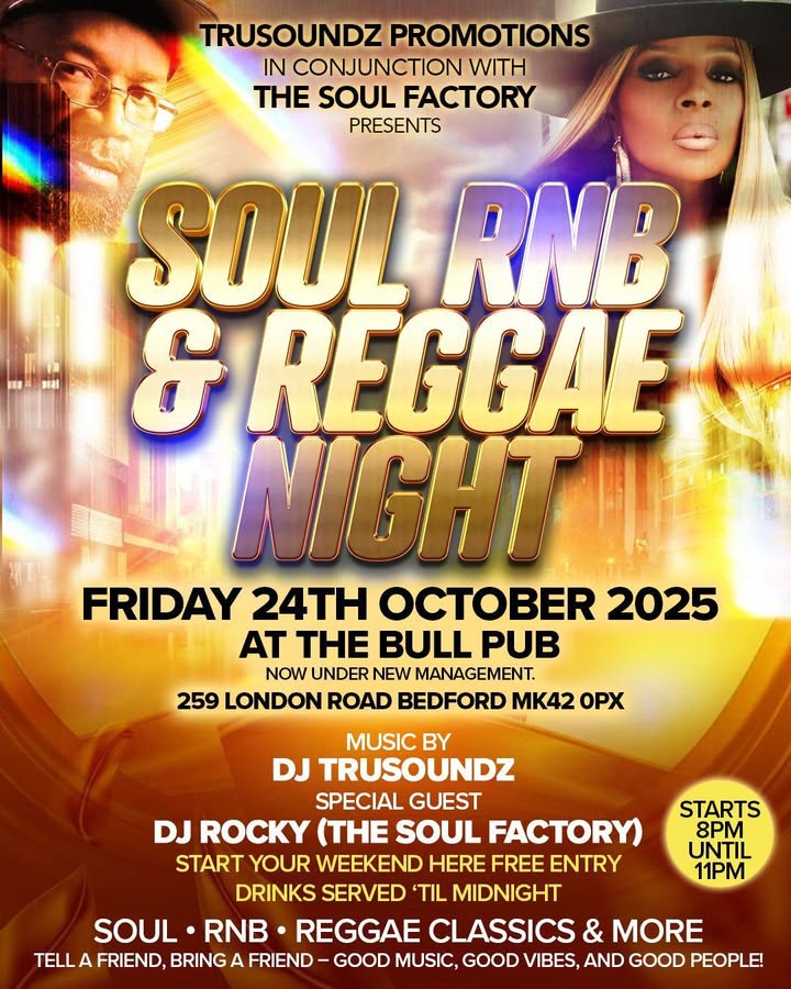 Get ready to kick off the weekend vibes at The Bull Bedford this Friday’s all about Soul, Reggae & R&B, with live DJs spinning the hottest tracks all night long. Feel the smooth grooves, deep basslines and feel good rhythms wash over you as the night rolls on, and let the laid back atmosphere of The Bull wrap you in pure weekend bliss. Grab a pint, hit the dance floor, and let the music take you there!